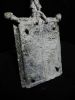 The shovel with a rectangular tray and horizontal handle. The tray is open at one end, with low vertical sides and narrow horizontal rim round three sides. The handle is modeled as a pillar with a capital, with foot extension projecting from the end, and acanthus leaf above. Two hollow pointed conical projections at the two inner corners of the tray, flanking the handle. Four short pegs at four corners under the tray, for support.