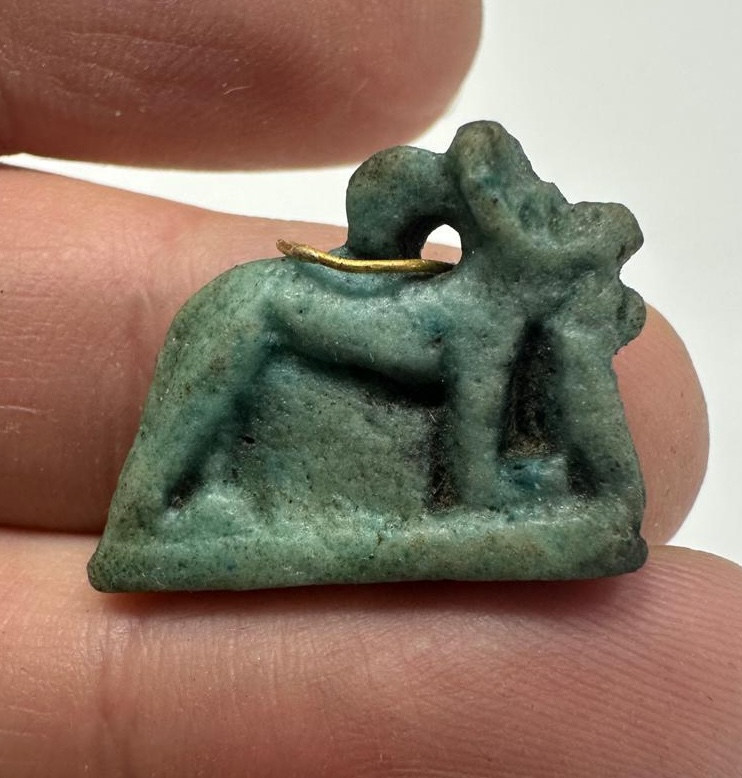 ANCIENT EGYPT. 26TH DYNASTY. FAIENCE ANUBIS (JACKAL) AMULET WITH THE ORIGINAL ANCIENT GOLD LOOP. 600 - 300 B.C