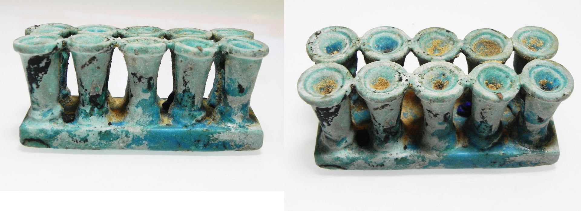 A stunning modeled offering with a flat, rectangular tray and ten conical cups with discoid bases and ringed rims arranged in two rows of five, all formed from faience. The base of each cup is integral with the tray upon which they stand, indicating the entire offering presentation was formed in a single cohesive mold. Traces of Kuhl still visible.