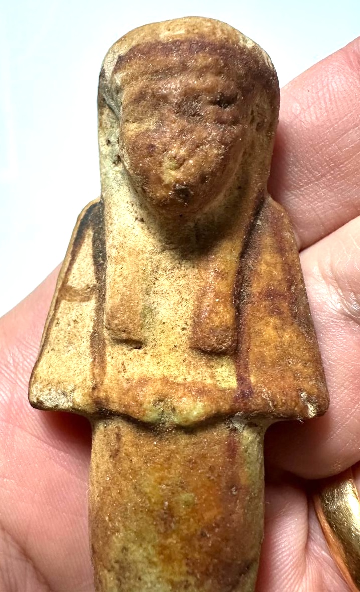 Ushabtis were placed in tombs as servants for the deceased, magically animated to perform labor on their behalf in the Fields of Reeds. The subtle facial features, detailed wig, and residual earthy patina offer a glimpse into its long burial history and authentic antiquity.
