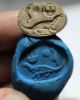 This is a motto scarab depicting the crocodile deity Sobek, god of fertility. The three signs may represent Re, Maat and the female sign, perhaps as a prayer to bless the whomb.