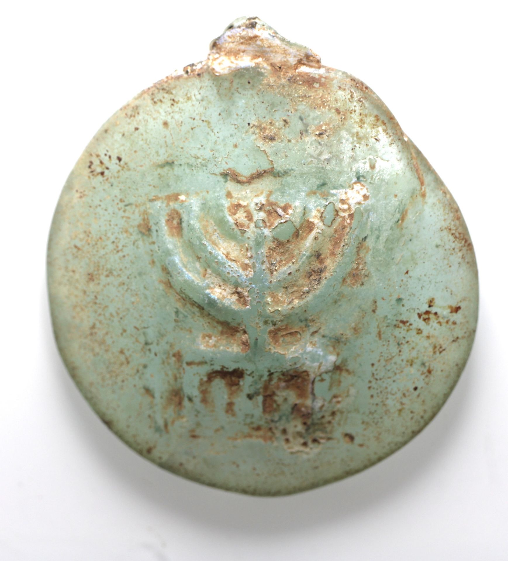ANCIENT JUDAEA. GLASS PENDANT WITH A MENORAH. 400 - 500 A.D