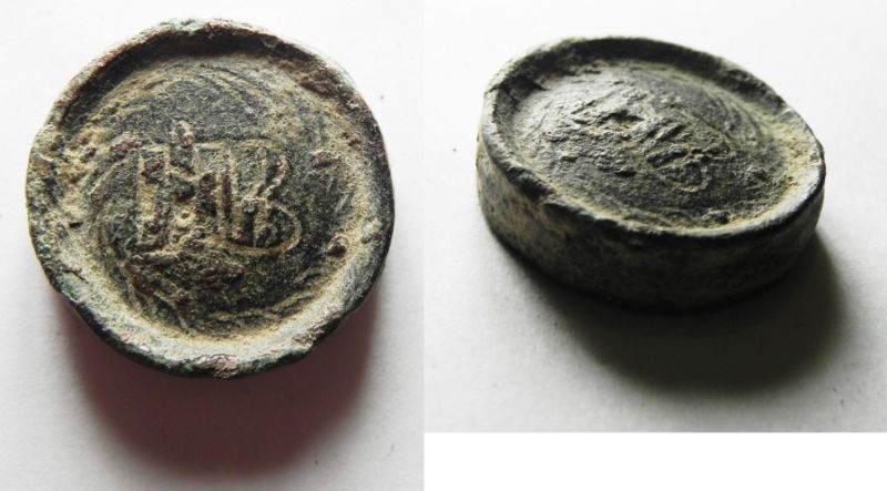 ROMAN BRONZE WEIGHT. 2 NUMISMATA. 9.16 GM, WITH NB WITHIN WREATH